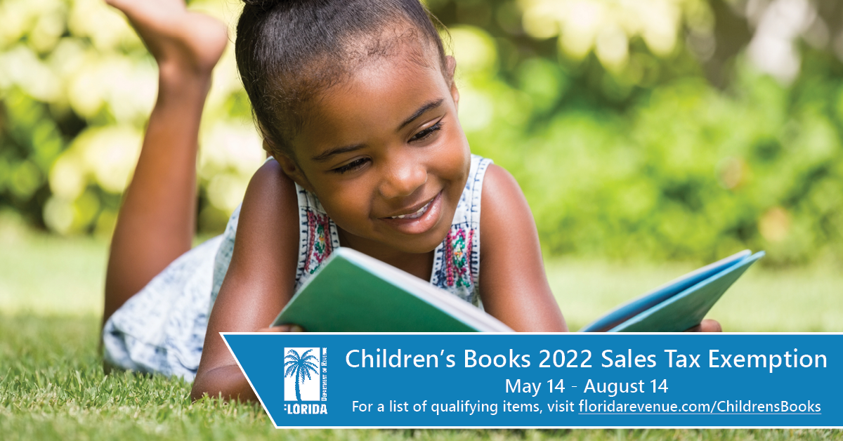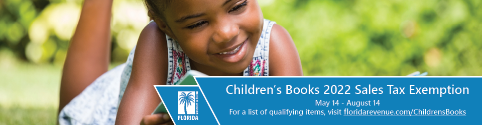 Consumers can purchase qualifying children’s books exempt from tax during the 2022 Children’s Books Sales Tax Exemption. Passed by the Florida Legislature and signed into law by Gov. Ron DeSantis, the sales tax exemption begins Saturday, May 14 and extends through Sunday, August 14. The Department of Revenue created this webpage to provide information and promotional materials for consumers, businesses, and other interested parties.